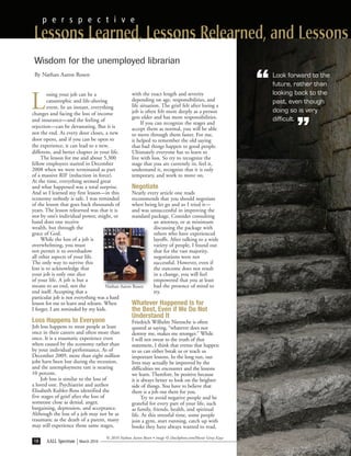 The document outlines lessons learned and strategies for coping with job loss, particularly for librarians. It emphasizes the importance of recognizing the emotional stages of grief associated with unemployment, maintaining a positive outlook, and actively networking. Additionally, it encourages seeking support, practicing interviews, and adapting to changes in the job market while recognizing that the job search process may take longer than expected.