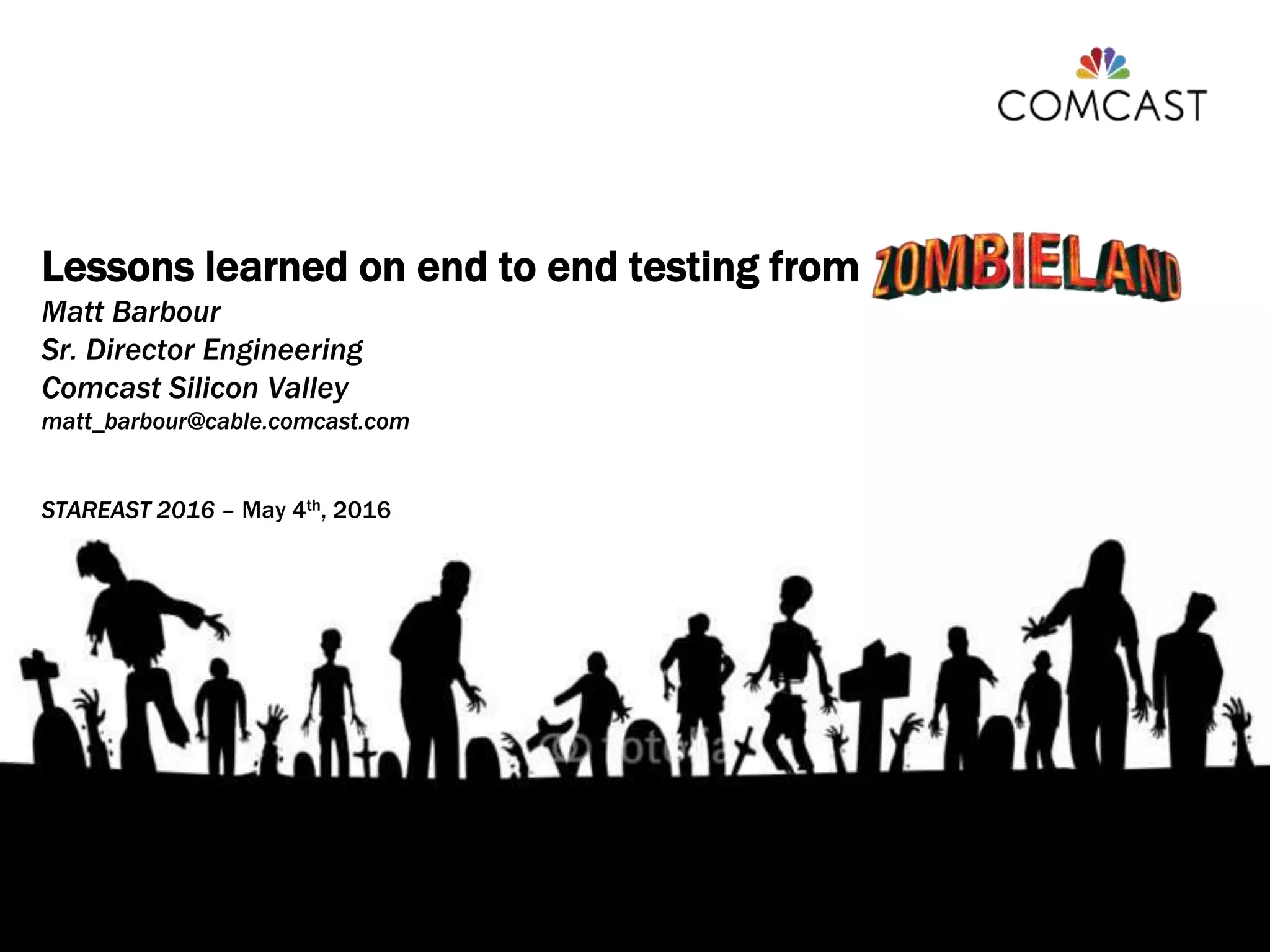 This document provides lessons learned about end-to-end testing based on metaphors from zombie movies. It discusses how end-to-end tests should expect failures like distributed systems due to real-world chaos. Tests need to balance being performant, accurate, repeatable, and meaningful. It provides tips for testing such as using dependency management, controlling all data, avoiding slow test methods, and sharing open-source testing tools and techniques with the community.