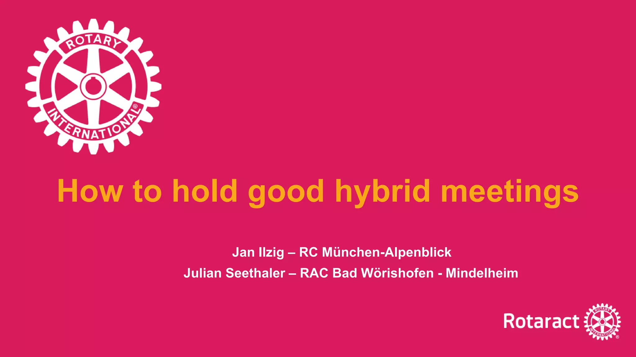 This document discusses best practices for holding hybrid Rotary meetings. It begins with asking participants about their experiences with online, in-person, hybrid, and no meetings during the pandemic. Small groups then discuss how they organized hybrid meetings, what went wrong, and what went well. The groups share a best practice example. The presenters thank participants and provide contact information.