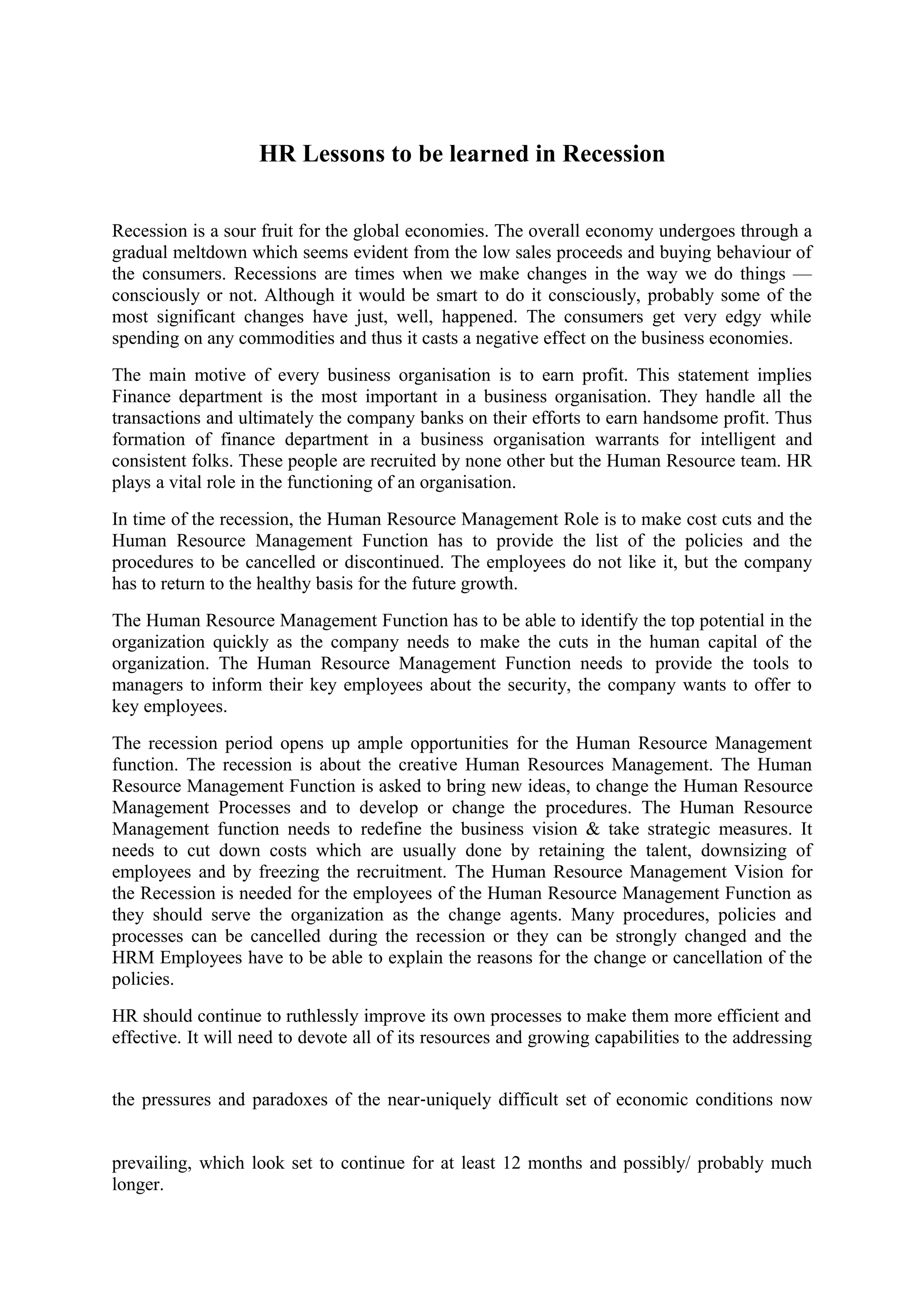 The document discusses the role of human resource management (HRM) during an economic recession. It states that during a recession, the key roles of HRM are to make cost cuts, identify top talent to retain, and provide tools to communicate with employees about job security. The recession presents opportunities for HRM to introduce new ideas and change processes to cut costs through actions like downsizing employees or freezing recruitment. HRM must also define initiatives to optimize resources, increase productivity, and ensure policies are up to date. Recessions impact employee morale, so effective communication from HRM is important to address fears and maintain performance.
