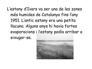 L’estany d’Ivars vaser una de les zones més humides de Catalunya fins l’any 1951. L’antic estany era una petita llacuna. Alguns anys hi havia fortes evaporacions i l’estany podia arribar a eixugar-se.