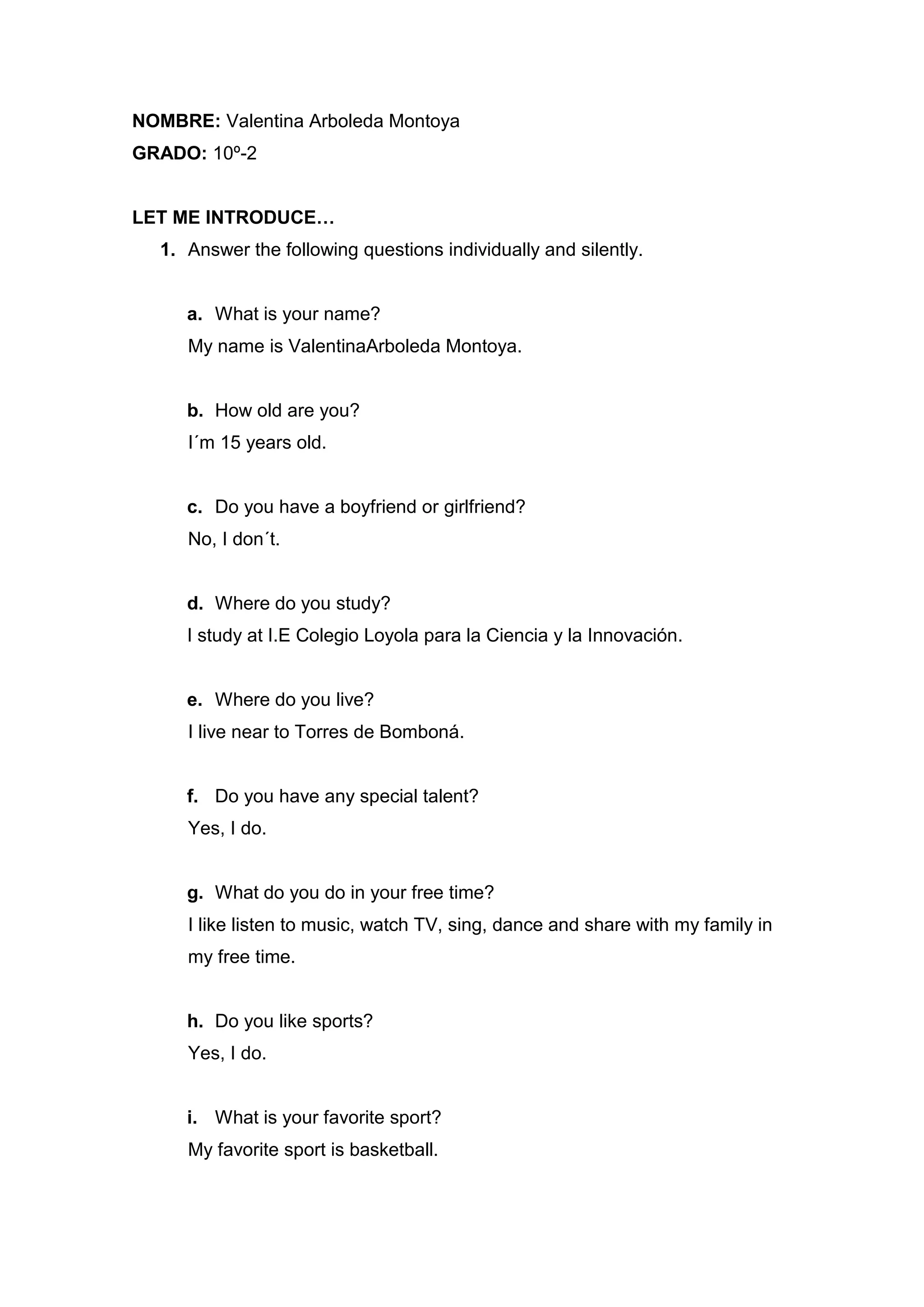 Valentina Arboleda Montoya is a 15-year-old student who lives near Torres de Bomboná and studies at I.E Colegio Loyola para la Ciencia y la Innovación. She enjoys listening to music, watching TV, singing, dancing and spending time with her family. Her favorite sport is basketball, TV show is American Best Dance Crew, movie is After Earth, music genres are pop and electronic, and singer is Katy Perry.