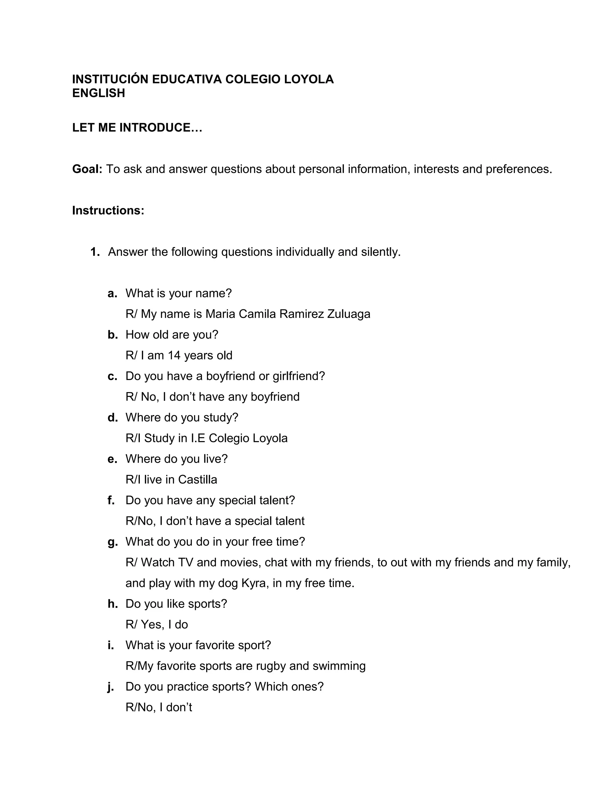 This document contains questions for students to ask and answer about each other's personal information, interests, and preferences. It instructs students to first answer the questions individually in writing, then pair up and ask each other the questions orally. Finally, students are asked to introduce their partner to the class, using expressions like "Let me introduce" and pronouns to describe their partner's name, age, favorite subjects and activities. The goal is to practice asking and answering personal questions as well as orally presenting information about another person.