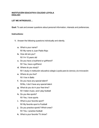 1) The document contains questions about a student named Juan Pablo Rojo asking for personal information such as his name, age, relationship status, where he lives, studies, hobbies, interests and preferences.