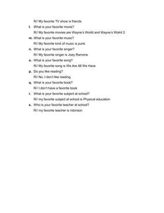 3) His favorite sport is football which he practices, and his favorite TV show, movie, music, singer and song are Friends, Wayne's World movies, punk music, Joey Ramone and "We Are All We Have" respectively.