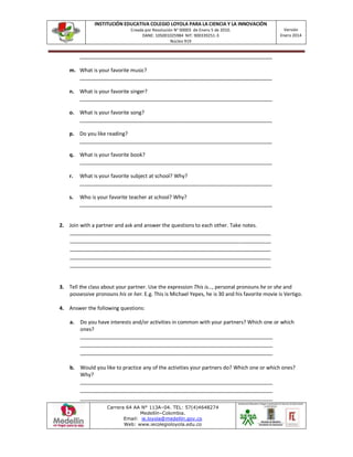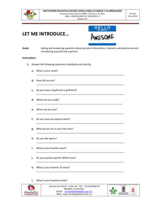 This document contains an activity to introduce oneself and a partner. It includes questions about personal information like name, age, hobbies, interests and preferences. Students answer the questions individually, then introduce themselves to a partner by asking each other the questions. They then present their partner to the class using phrases like "This is...he/she likes...". Finally, students reflect on common and different interests between themselves and their partner. The activity aims to practice asking and answering personal questions in English.