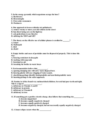 This document contains a 15-item practice test for the LET General Science exam. Each item contains a question with 4 answer options. The questions cover topics in general science including biology, ecology, chemistry, physics and earth science. An answer key is provided at the end with the correct response identified for each item. Background information is also provided on the author, Crisencio Paner, who has extensive experience as a teacher and researcher.