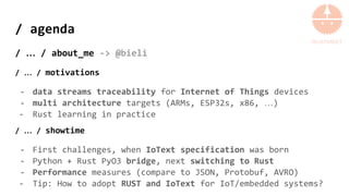 This presentation highlights the creation of the IoText protocol for IoT data streams, supporting various architectures like ARMs, ESP32s, and x86. You'll learn Rust practically while understanding the protocol's evolution, its transition from Python to Rust, and performance comparisons with JSON, Protobuf, and AVRO.
