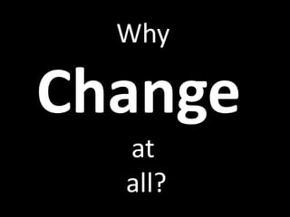 The document discusses the need for change when adopting agile practices. It emphasizes that change does not work with a one-size-fits-all approach and must consider context, culture, environment, and people. Successful change requires crafting an individualized change framework that is feedback-driven, validates learning, and provides options and choices.