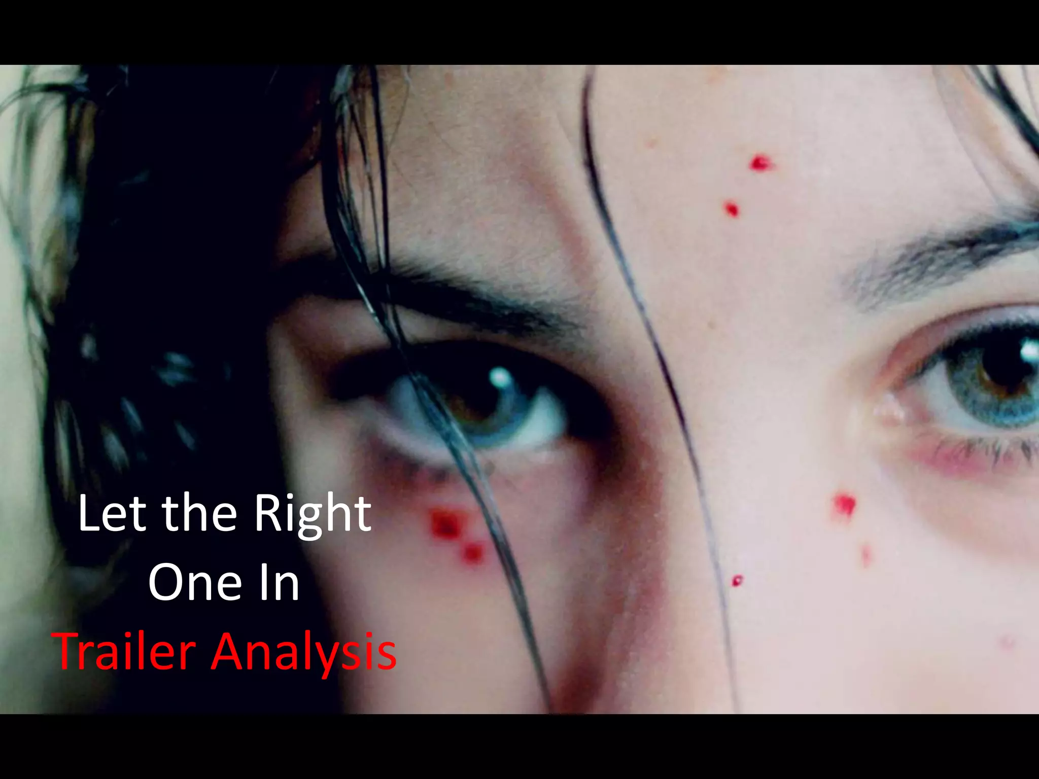 The trailer uses sound and imagery to build tension and intrigue around the relationship between vampire Eli and bullied boy Oskar. Scenes of Oskar being tormented are juxtaposed with increasingly disturbing shots of Eli's violent nature to raise questions about her character. The use of music, lighting and editing keeps audiences unsettled as clues emerge that Eli is a vampire who kills to survive, yet cares for Oskar. A quote praising the film as a "masterpiece" is displayed to encourage viewers to learn more.