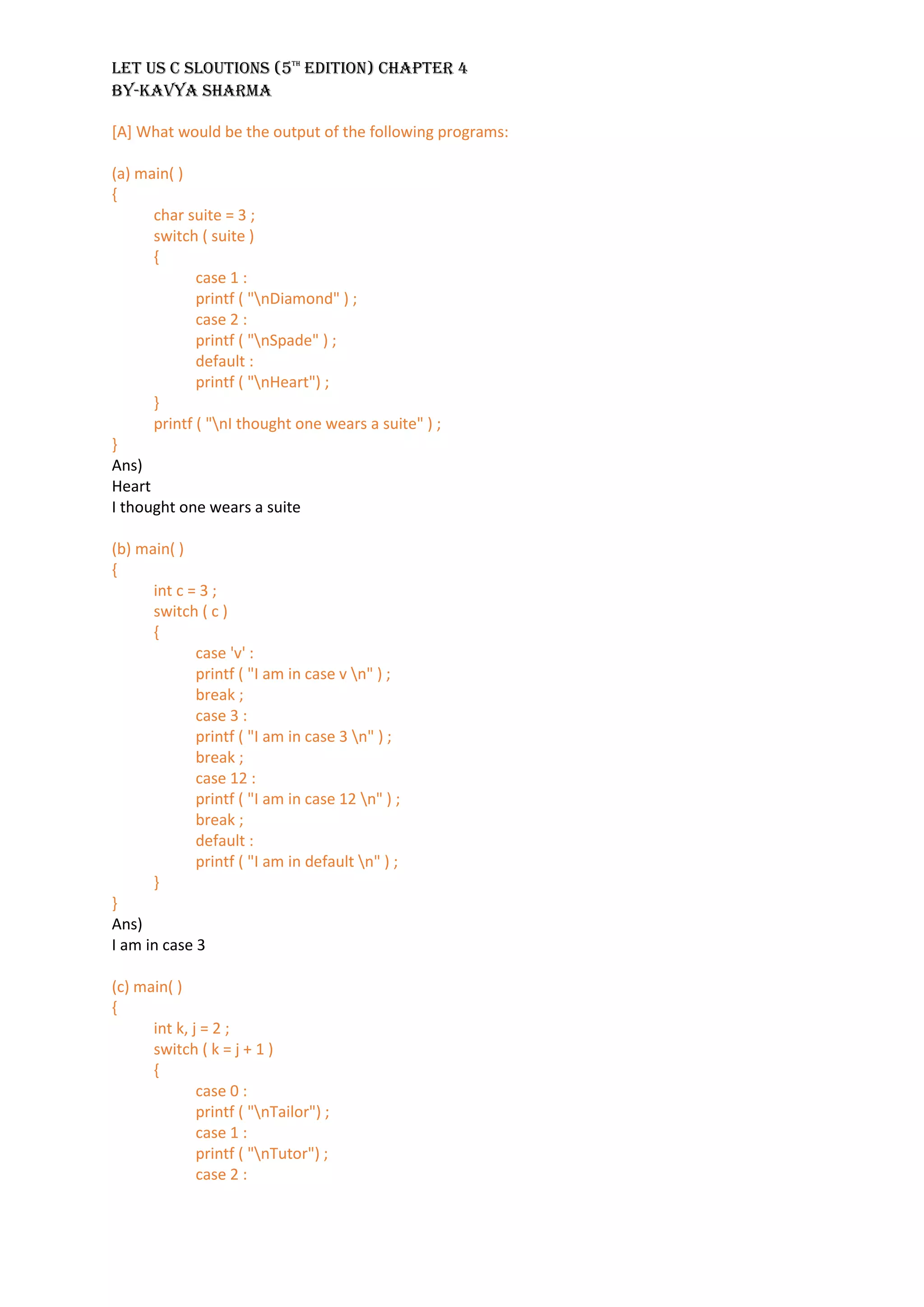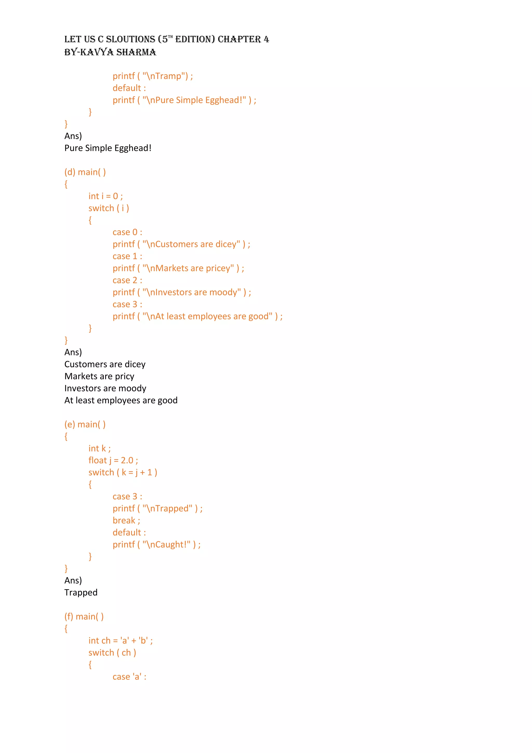 This document contains solutions to questions from Chapter 4 of the book "Let Us C Solutions" (5th Edition) by Kavya Sharma. It includes: