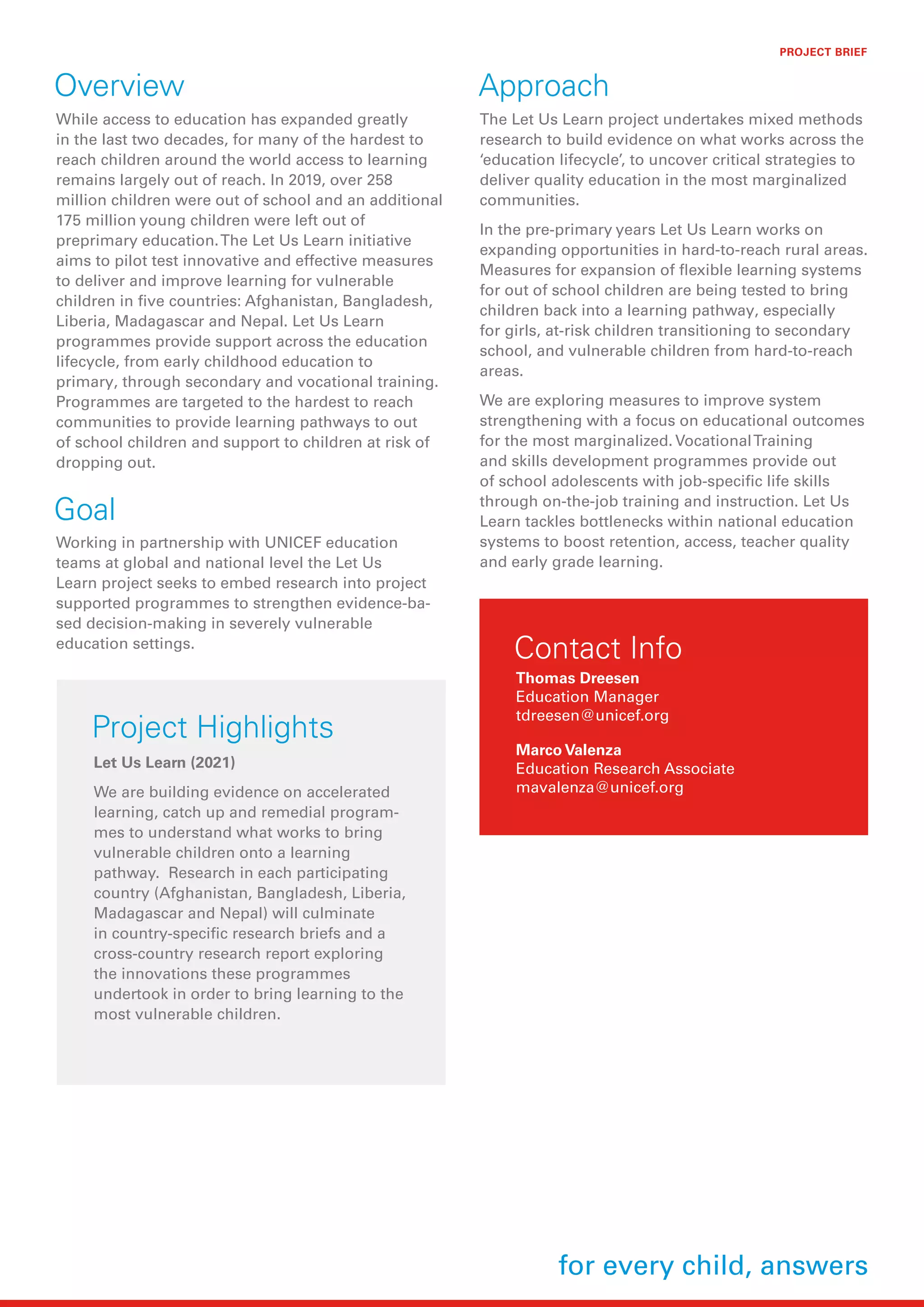 The 'Let Us Learn' initiative aims to improve educational access for the most vulnerable children in five countries (Afghanistan, Bangladesh, Liberia, Madagascar, and Nepal) who are often out of school. By employing innovative measures and mixed methods research, the project seeks to identify effective strategies for supporting learning from early childhood through vocational training. The initiative focuses on boosting retention, access, and overall educational outcomes in severely marginalized communities, partnering with UNICEF for evidence-based decision-making.