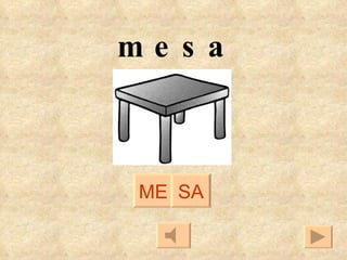 The document contains a list of Spanish words related to furniture, food, animals and other common nouns. Each word is repeated multiple times with different combinations of letters. The words include: mesa (table), mula (mule), suma (sum), lima (lime), pala (shovel), pelo (hair), sopa (soup), pela (peel), pie (foot), paloma (pigeon). The document seems to be practicing spelling and combinations of letters for basic Spanish vocabulary words.