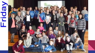 The document summarizes a group's week long trip to Lithuania from March 26th to 31st, 2017. On the trip, the group visited several educational and cultural sites around Lithuania including the Hill of Crosses, a school where they learned about Lithuanian culture and performed dances, the city center and river, an amusement park, Nida for the Hill of Witches and sand dunes, and an art gallery. The group participated in music, dance, art, and sports lessons and activities during their time in Lithuania before thanking their hosts and looking forward to their next destination in Latvia.