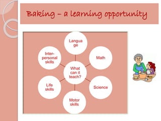 This document discusses how baking a cake can be used as a learning opportunity to develop various skills in children. It describes how baking can help develop reading and writing skills through reading recipes and instructions. It also helps develop fine motor skills through actions like stirring and whisking. Mathematical skills like measurement, estimation, and understanding fractions are practiced. Scientific questions can be asked about the chemical processes involved. Additionally, life skills such as cooking, budgeting, decision making, and teamwork are developed through a collaborative baking experience.