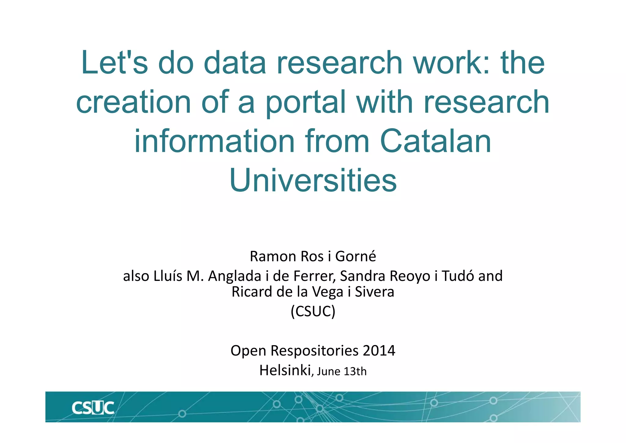The document discusses plans to create a portal with research information from Catalan universities. It describes consolidating existing university repositories and services into a new consortium. The proposed Research Portal of Catalonia (PRC) would harvest and aggregate research output data from various university repositories and databases. Decisions made for the PRC include using ORCID identifiers, the DSpace+CINECA CRIS software, and the CERIF data exchange format. Current achievements include exporting sample data from universities and implementing ORCID in their systems. Future work includes fully implementing the PRC, designing interfaces, and developing mechanisms for ingesting and harmonizing data.