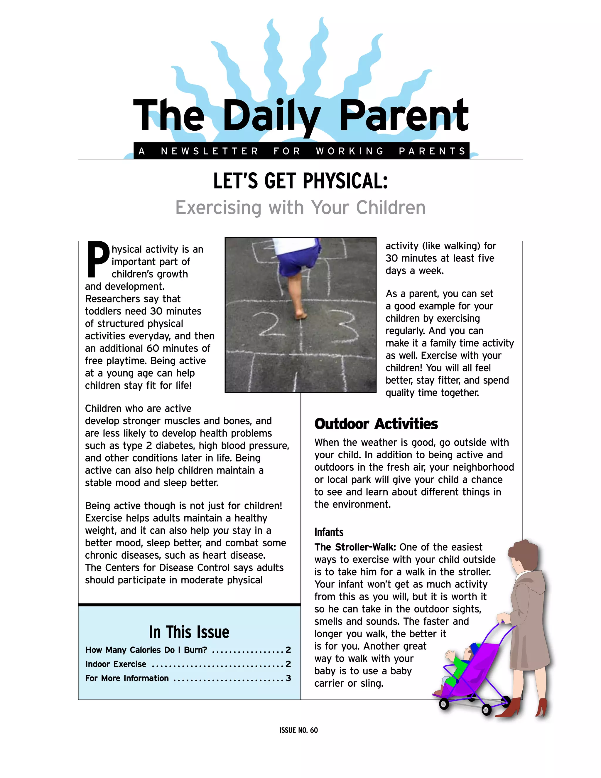This document provides tips for exercising with children of different ages. It recommends that toddlers get 30 minutes of structured activity and 60 minutes of free play daily. Suggested activities include walking, playing catch, gardening, dancing, and cleaning. Preschoolers can play ball, jump rope, and help with chores. The document also recommends adults aim for 30 minutes of moderate activity most days and provides indoor exercise options like dancing and stretching.