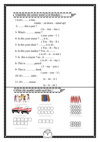 The document contains an English language lesson for students, with exercises including rearranging sentences, filling in blanks, matching pictures to words, and choosing the correct answers. Some of the topics covered include introductions, family members, activities, weather, numbers and colors. The exercises are meant to practice vocabulary, grammar, spelling and comprehension.