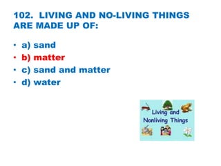 This document contains 180 multiple choice questions about science concepts such as matter, materials, properties, energy sources, simple machines, and more. The questions cover topics like the states of matter, classifying materials as natural or man-made, uses of common materials like wood and minerals, renewable and non-renewable energy sources, how machines make work easier, and examples of simple machines and compound machines.