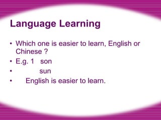 1. The document discusses various aspects of learning English including differences between English and Chinese, forms of English verbs, tenses, and provides an exercise to test understanding of tenses.