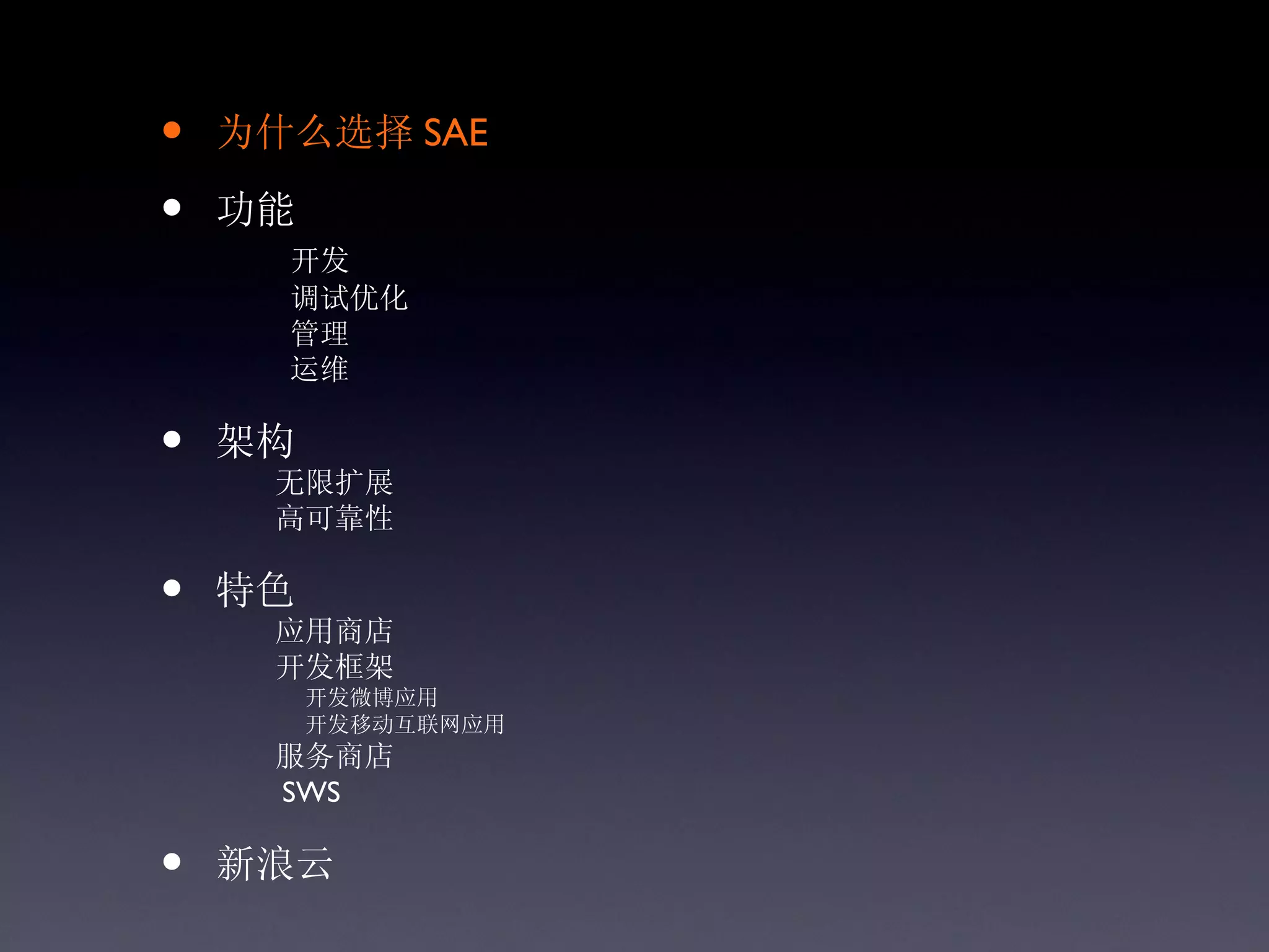 该文档介绍了新浪应用引擎(SAE)的各种功能与特性,包括无限扩展性、高可靠性及开发者支持。它讨论了开发、调试优化、管理和运维功能,以及相应的服务商店和应用商店。文档还涉及了云计算技术的演变和新浪云的相关产品与服务。