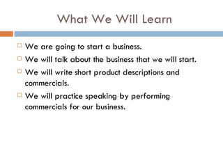 The document discusses starting a coffee business. It asks students to identify common coffee products like coffee beans, bags of coffee, and coffee cups. It asks students about their coffee preferences and shopping habits. It then has students brainstorm names and descriptions for their imaginary coffee business, with examples like "Quality Coffees, Low Prices" and "Coffees, Supplies, and More". Finally, it asks students to partner up and write their own description for the coffee business.