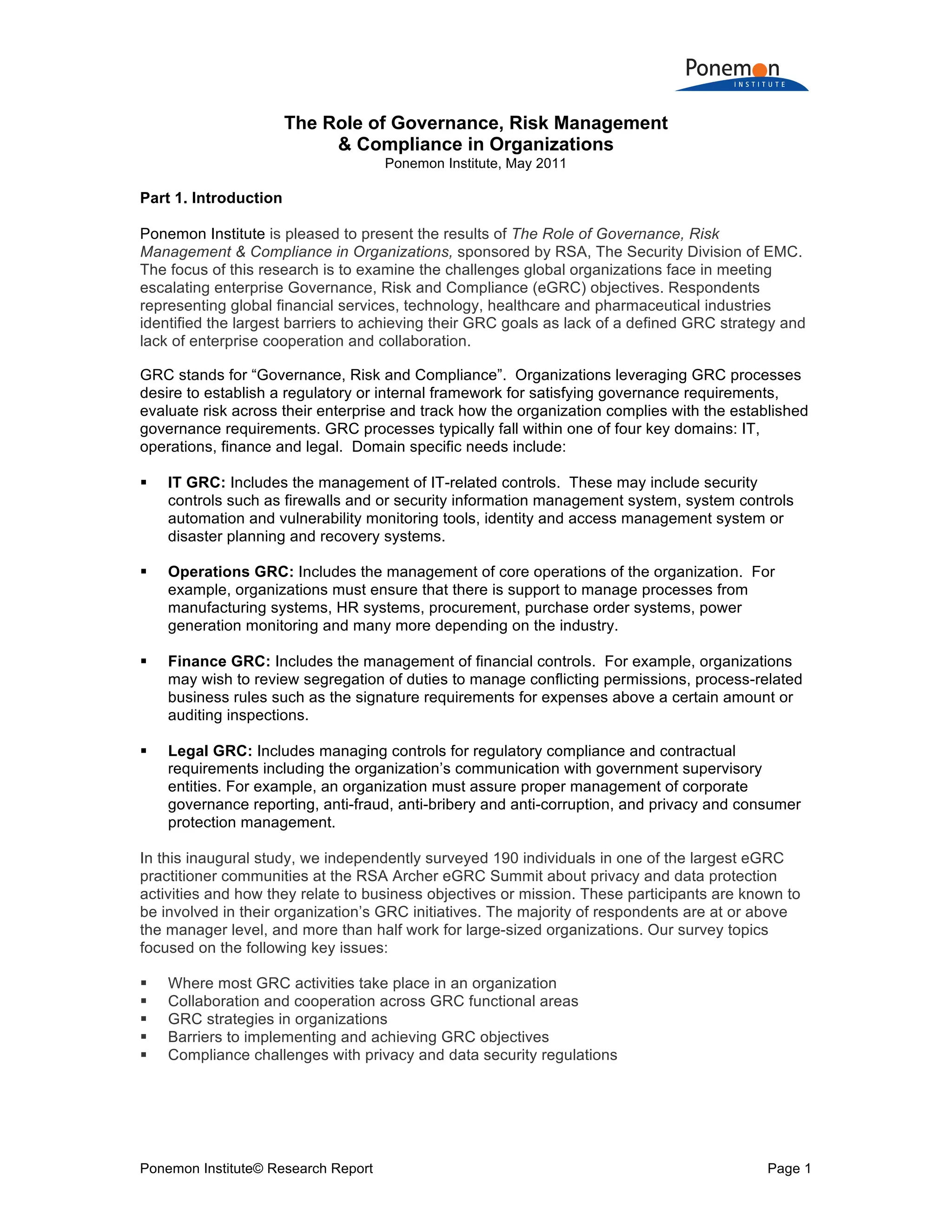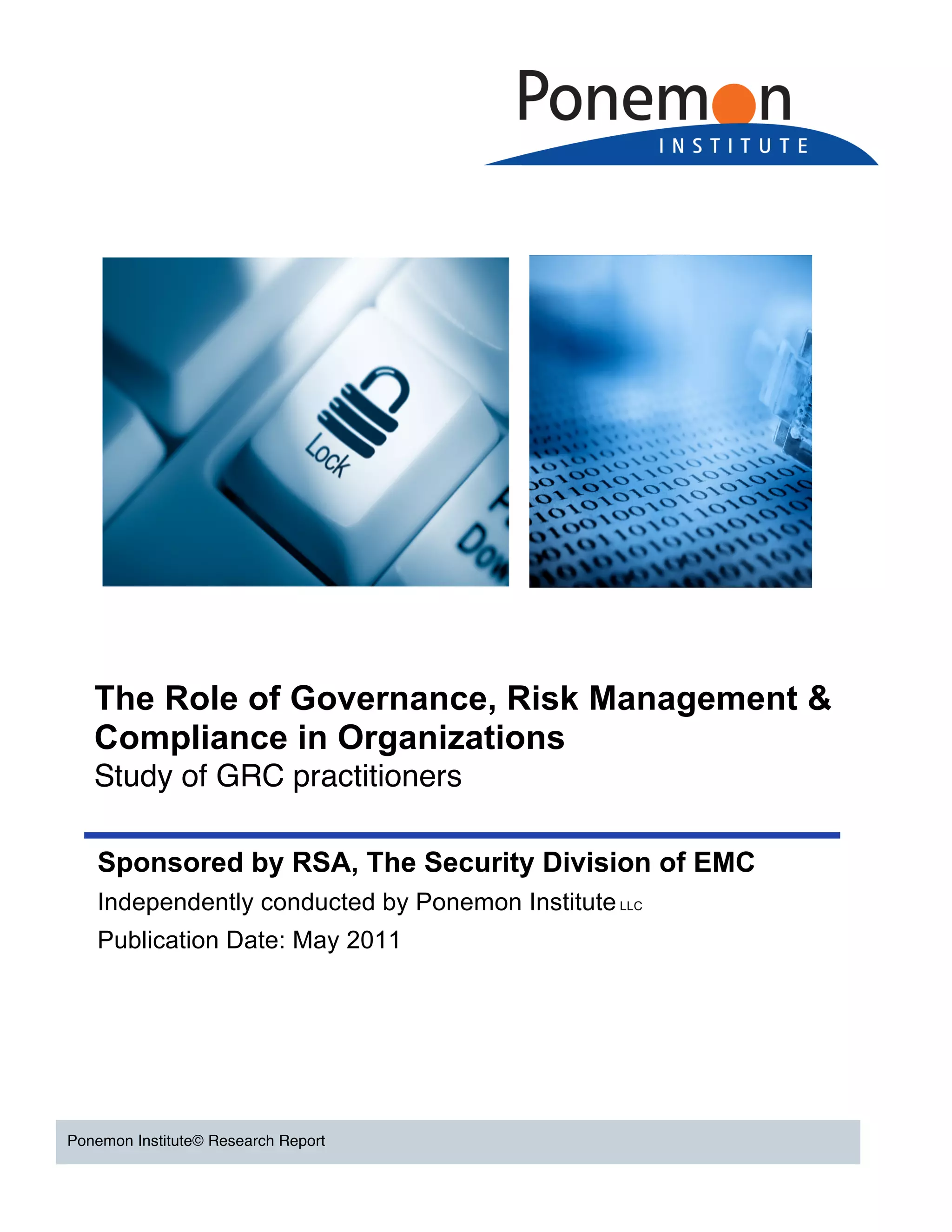 This document summarizes the results of a study on governance, risk management, and compliance (GRC) practices. The study found that GRC activities are most commonly centered in IT departments and that the largest barriers to effective GRC are a lack of collaboration and resources. It also found that establishing a clear GRC strategy and assessing risk are seen as most essential but are still challenges for many organizations. Ensuring security of data shared with third parties and complying with privacy regulations were cited as the top privacy-related issues.