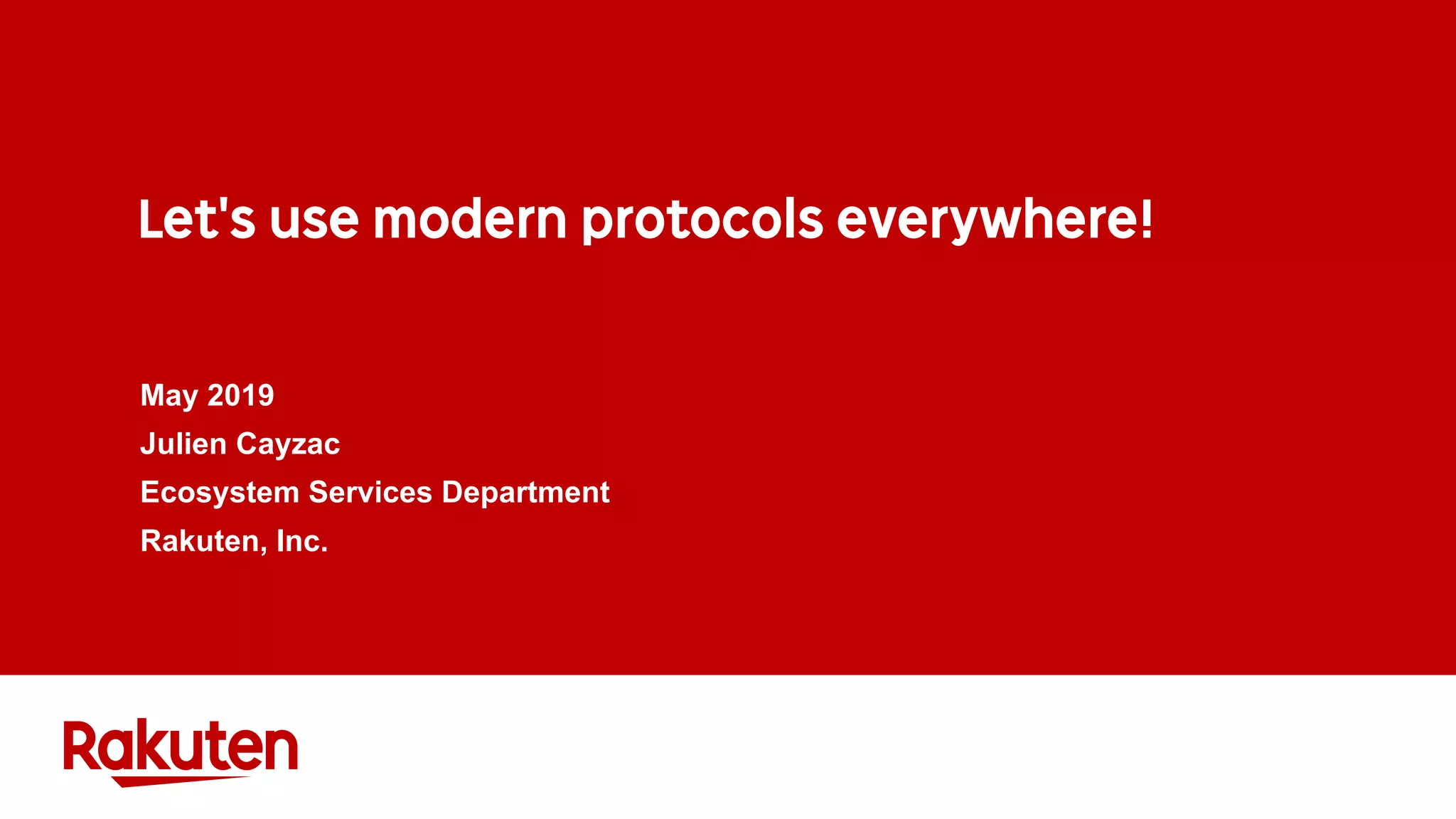 HTTP/1.1 is an obsolete and inefficient protocol for web communication. HTTP/2 provides major improvements such as header compression, multiplexing of requests and responses, and server push that can reduce webpage loading times by over 50%. HTTP/3 is expected in 2019 and will replace TCP with the UDP-based QUIC protocol, addressing limitations of TCP like head-of-line blocking and allowing for faster 0-RTT connections. Organizations should adopt HTTP/2 now and prepare for HTTP/3 to improve performance of their web applications and infrastructure.