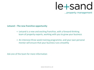 Letsand is a new property franchise opportunity that provides an intensive three week training program and ongoing mentorship. Franchisees benefit from experienced franchise owners and staff who can help grow their business. The affordable franchise fee of £6,950 includes business templates, marketing materials, training, an online business profile, and operations support. Letsand is seeking motivated entrepreneurs interested in starting their own property services business.