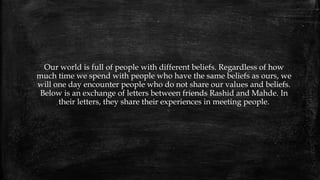 Rashid and Mahde are friends who have been living in different cities. Mahde shares in a letter that he has been staying with his aunt in Taguig City to take care of her house. There, he has met schoolmates from different religious backgrounds like Christian, Iglesia ni Cristo, and Seventh-day Adventist, who he does school assignments and community service projects with peacefully. Rashid responds that their mutual friends miss Mahde and hope to see him again soon.