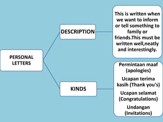 This document provides information about personal letters, including their description, kinds, and structure. It describes personal letters as a way to inform or tell something to family or friends and notes they should be written well, neatly and interestingly. It lists some common kinds of personal letters like apologies, thank you's, and congratulations. The structure of a personal letter is then outlined, including the sender's address, date, salutation, introductory paragraph, body paragraph, closing paragraph, complementary close, signature, and optional postscript. Examples of expressions used in different parts of personal letters are also provided.