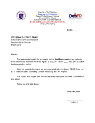 A teacher is requesting double payment for her maternity leave that took place from April 1 to May 2011. Part of her maternity leave fell within the long vacation period for schools. She has attached her approved leave application, DECS Order No. 87 s. 1988, and other supporting documents to support her request for double payment during the period that overlapped with the long vacation. She hopes the Schools Division Superintendent will consider her request favorably.
