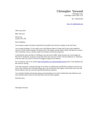 Christopher Yarwood is writing to inquire about potential work opportunities at BBC Television. He has recently completed media and film study courses and is interested in television production. Yarwood has experience working on film shoots and creating his own films. He believes working for the BBC would be the next step in his career. Samples of his work can be found on his website and he is hardworking with creative ideas.