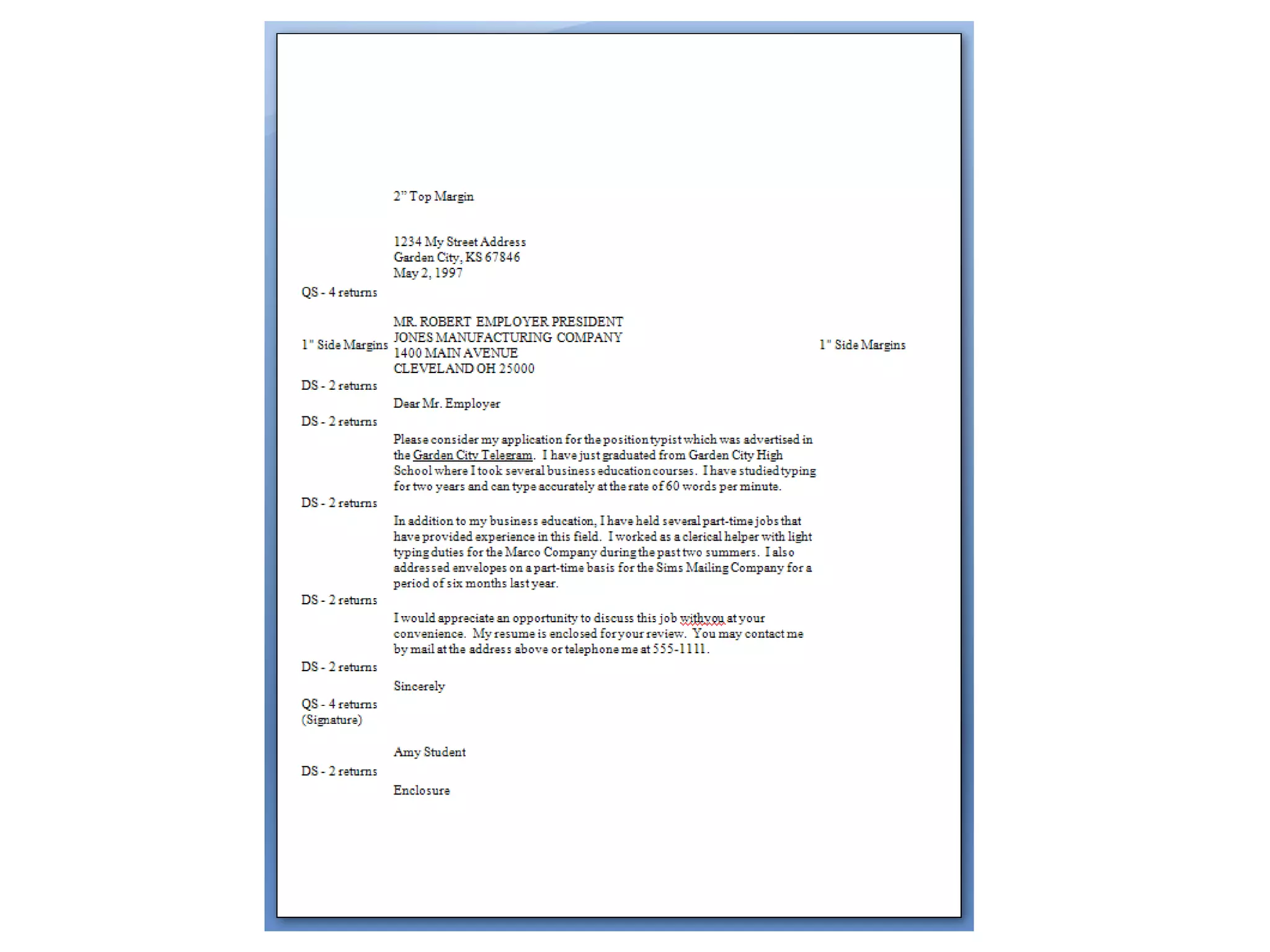 This document provides guidance on writing formal business letters. It outlines the typical parts of a letter, including the return address, letter address, salutation, body, and complimentary close. Specific instructions are given for formatting aspects like margins, spacing between sentences and paragraphs, and including enclosures or initials. The purpose of a letter and common letter recipients are also briefly mentioned.