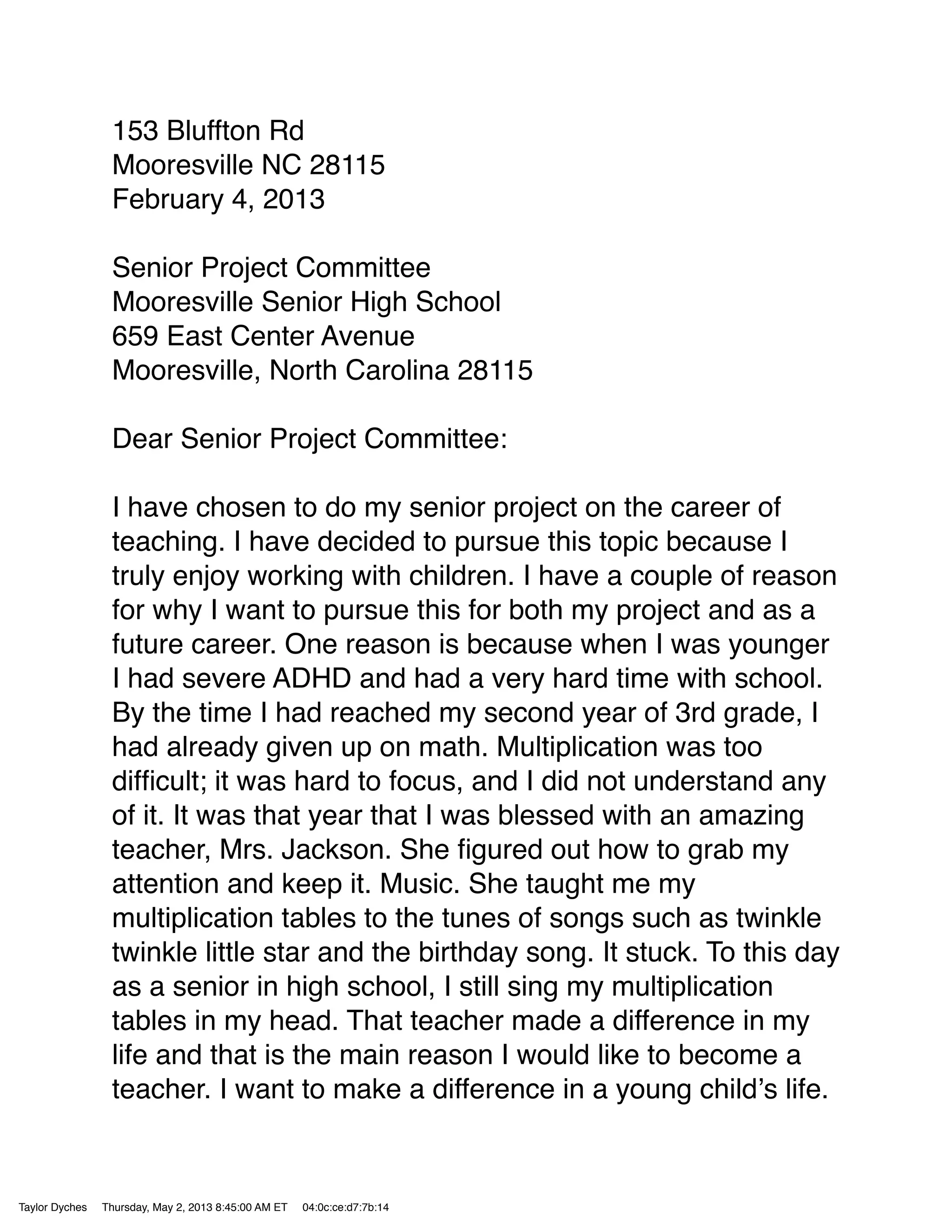 Taylor has chosen to do her senior project on the career of teaching. She wants to pursue this career because she had an amazing 3rd grade teacher, Mrs. Jackson, who helped her overcome challenges with ADHD and learning multiplication through song. Taylor also enjoyed teaching and answering questions for the young children she babysat. For her project, Taylor plans to research what it takes to be a good teacher, the education and certification required, a teacher's daily life challenges. She will interview her former teacher Mrs. Jackson and shadow other teachers to learn different teaching styles. Taylor will complete her required observation hours at South Elementary School and create a lesson plan for her project.
