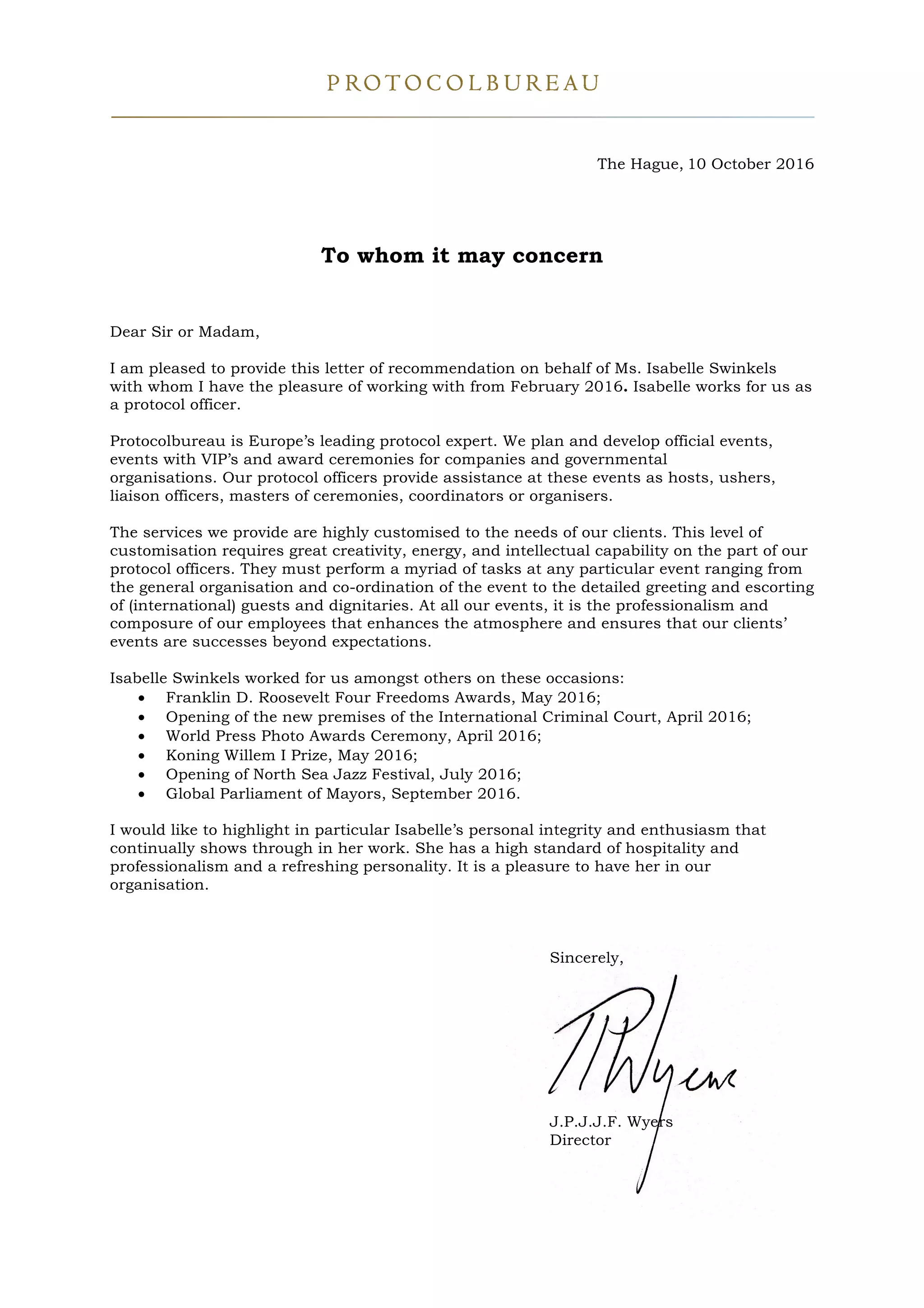 Isabelle Swinkels has worked as a protocol officer for Protocolbureau, Europe's leading protocol expert, since February 2016. Protocolbureau plans official events for companies and governments. Ms. Swinkels helped organize and coordinate several high-profile events, including awards ceremonies and openings. She displayed great creativity, energy, professionalism, and composure in handling her myriad tasks, which enhanced the success of the events. The director recommends Ms. Swinkels highly due to her integrity, enthusiasm, hospitality, and refreshing personality.