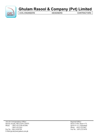 This document authorizes Mr. Asif Hussain to use a vehicle for the Naruri Rehara to Rawalakot Road project in AJK. It provides contact information for Ghulam Rasool & Company, a civil engineering firm, and confirms that the original vehicle documents are kept at their Rawalakot office. The project manager, M. Hafeez Anwar, signs on behalf of Ghulam Rasool & Company.