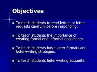 The document provides guidance on letter writing, emphasizing the importance of reading and understanding letter formats, etiquette, and tone for effective communication. It covers various letter types including personal and business letters, along with their specific formats and purposes, such as apologies, requests, and job applications. Additionally, it outlines the structure of both personal and business letters and offers practical tips for writing and responding to letters.