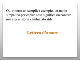 Il documento esplora vari stili didattici, evidenziando come lo stile sia l'espressione personale e creativa di scrittura. Vengono forniti esempi di lettere d'amore che utilizzano diversi stili: conciso, enfatico, arcaico-ampolloso, burocratico e matematico. Ogni stile ha caratteristiche distintive che influenzano il modo in cui i sentimenti e le idee vengono comunicati.
