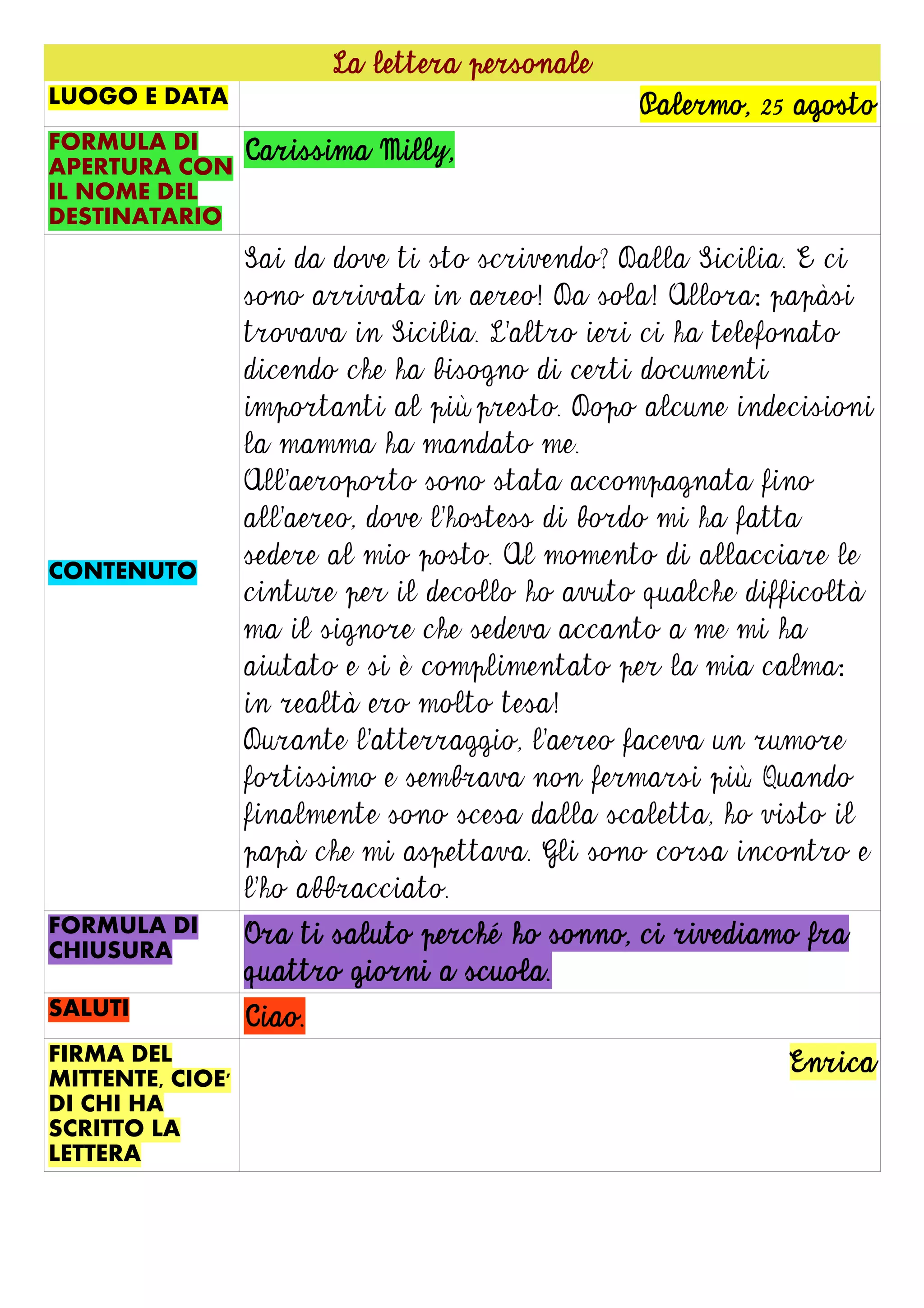 La lettera è scritta da Enrica, che racconta della sua recente visita in Sicilia per portare documenti al padre. Dopo un viaggio in aereo da sola, con qualche difficoltà durante il decollo e l'atterraggio, è finalmente arrivata e si è riunita con il padre. Conclude la lettera dicendo di avere sonno e di rivedersi tra quattro giorni a scuola.