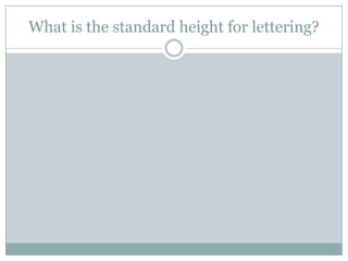 The standard height for lettering is 1/8 inches. Capital letters should be used in almost all cases. When lettering, keep it neat, write in all capital letters, and use guidelines for equal height but not equal spacing between letters. Fraction lines should not be angled.