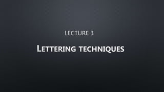 Lettering is an essential element in engineering drawings that provides notes, annotations, and other information in a legible and uniform manner. There are two main types of lettering: double stroke and single stroke. Single stroke lettering is created using a single line and is further divided into vertical and inclined styles. Proper lettering conventions include using all capital letters, uniform size and thickness, and kerning between letters. Guidelines are also important for placement and consistency of lettering. Various lettering groups have standardized stroke orders to improve legibility. Spacing between letters and words must be uniform for readability. Lettering is a key skill for clear technical communication in engineering drawings.