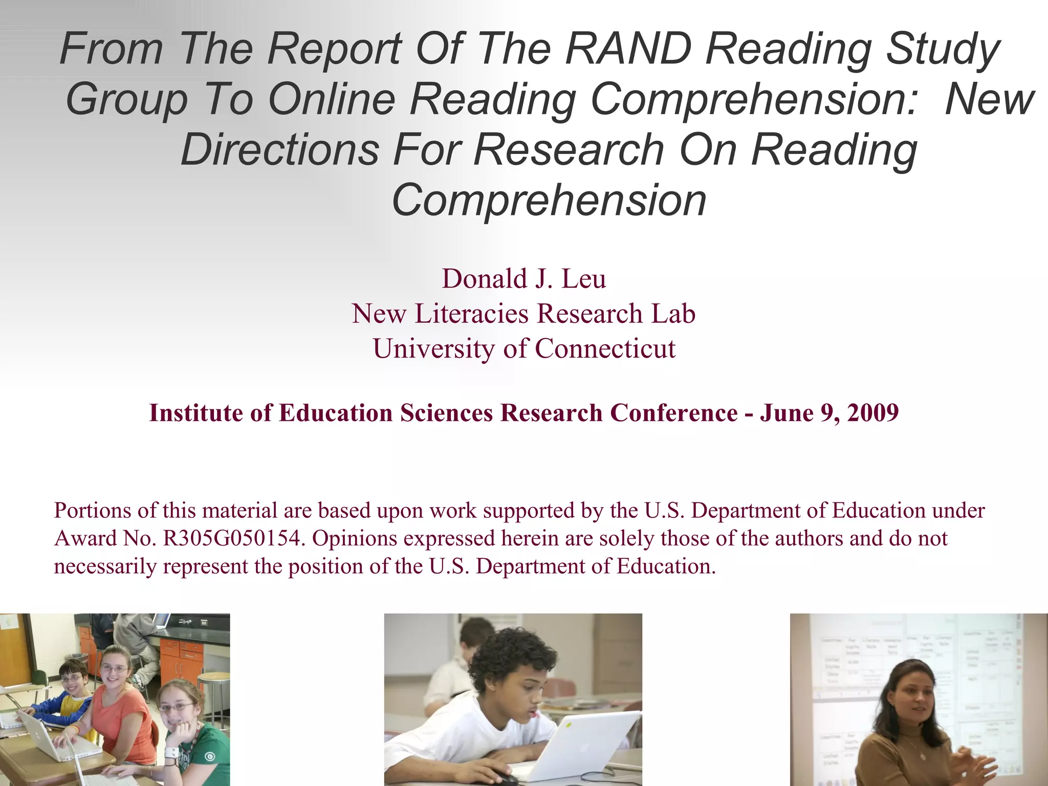 The document presents a report from the RAND Reading Study Group discussing the complexities of online reading comprehension, emphasizing the need for a more robust understanding of the skills required in today's digital context. It identifies priority research areas such as teacher preparation, professional development, and assessment, and highlights the importance of adapting educational practices to enhance students' proficiency in online reading. The report warns that neglecting research in this area may worsen educational inequalities, as access to and success in online learning varies significantly across socioeconomic backgrounds.