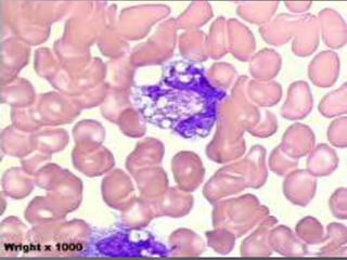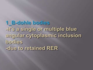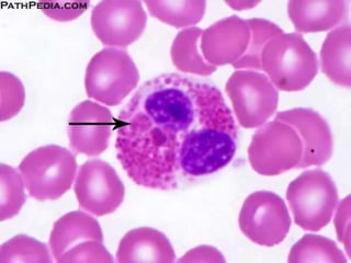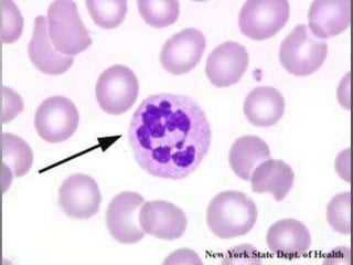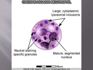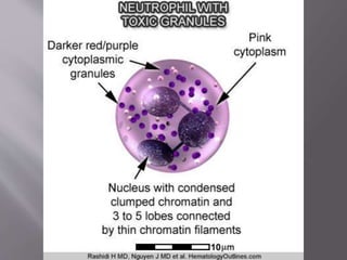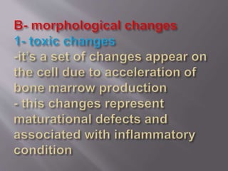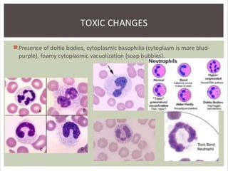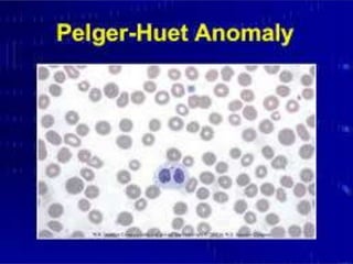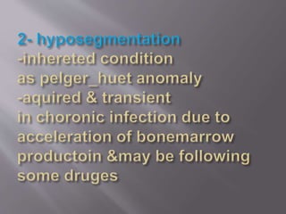 The document discusses different types of blood disorders including congenital, morphological, qualitative, and quantitative disorders. It also lists different stages of white blood cell development from myeloblast to neutrophil and describes levels of left shift from slight to extreme.
