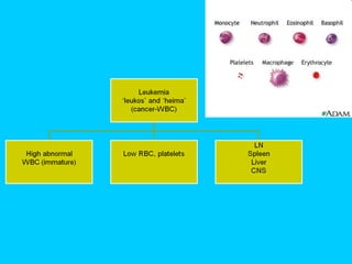 This document provides information about leukemia, including definitions, types, characteristics, and classifications. It defines leukemia as a malignant disease of hematopoietic tissue characterized by replacement of normal bone marrow elements with abnormal cells. It describes the four main types of leukemia - acute myelogenous, chronic myelogenous, acute lymphocytic, and chronic lymphocytic leukemia. It also covers topics like acute vs chronic leukemia, AML vs CML, FAB vs WHO classification systems, and myelodysplastic syndromes.