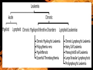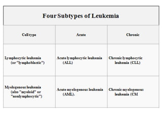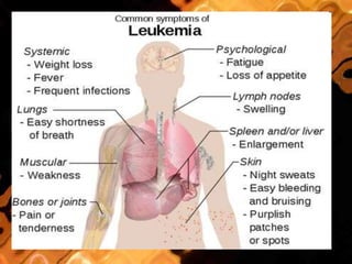 This document discusses leukemias and provides information about leukemoid reactions. It defines a leukemoid reaction as a high white blood cell count with neutrophilia usually in response to infection, which can mimic chronic myelogenous leukemia or acute myeloid leukemia. The document notes that serum leukocyte alkaline phosphatase is normally elevated in leukemoid reactions, distinguishing it from CML where it is depressed. Features suggesting a leukemoid reaction rather than leukemia include toxic granulation, a high LAP score, and an obvious cause of the neutrophilia such as infection. The document provides several potential causes of leukemoid reactions and discusses methods for distinguishing leukemoid reactions from leukemia.