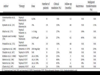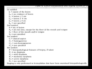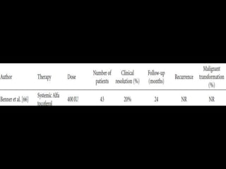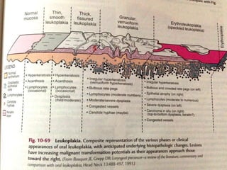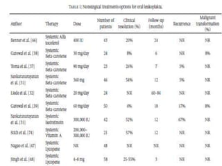 Leukoplakia is a predominantly white lesion of the oral mucosa that cannot be characterized as any other definable lesion. It is most commonly caused by tobacco use. Leukoplakia can be classified as homogenous or non-homogenous. Homogenous leukoplakia appears as a flat, white patch and has a low risk of malignant transformation, while non-homogenous leukoplakia contains red areas and has a higher risk of becoming cancerous. Diagnosis is made through biopsy and examination under light microscopy to check for epithelial dysplasia. Treatment involves eliminating possible irritants and monitoring for signs of malignant transformation.