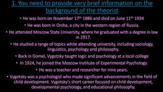 Lev Vygotsky was a Russian psychologist born in 1886 who developed the Social Development Theory. His theory addressed cognitive development and the role of social interaction and culture in children's development. He believed that social interaction and relationships with supportive adults are essential for children to develop higher thinking skills. Vygotsky's zone of proximal development describes how adults should interact with children to extend their learning by providing scaffolding support that is gradually reduced as skills develop. His theory emphasizes that social interaction and culture play a central role in children's cognitive development.