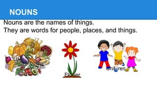 This document provides information about nouns, countable and noncountable nouns, articles, adjectives, verbs tenses including present progressive, simple present, future, past tense and comparisons of adjectives. It defines nouns and different types of nouns. It explains how to form and use present progressive, simple present, future and past verb tenses. It also covers formation of comparative adjectives and provides examples.