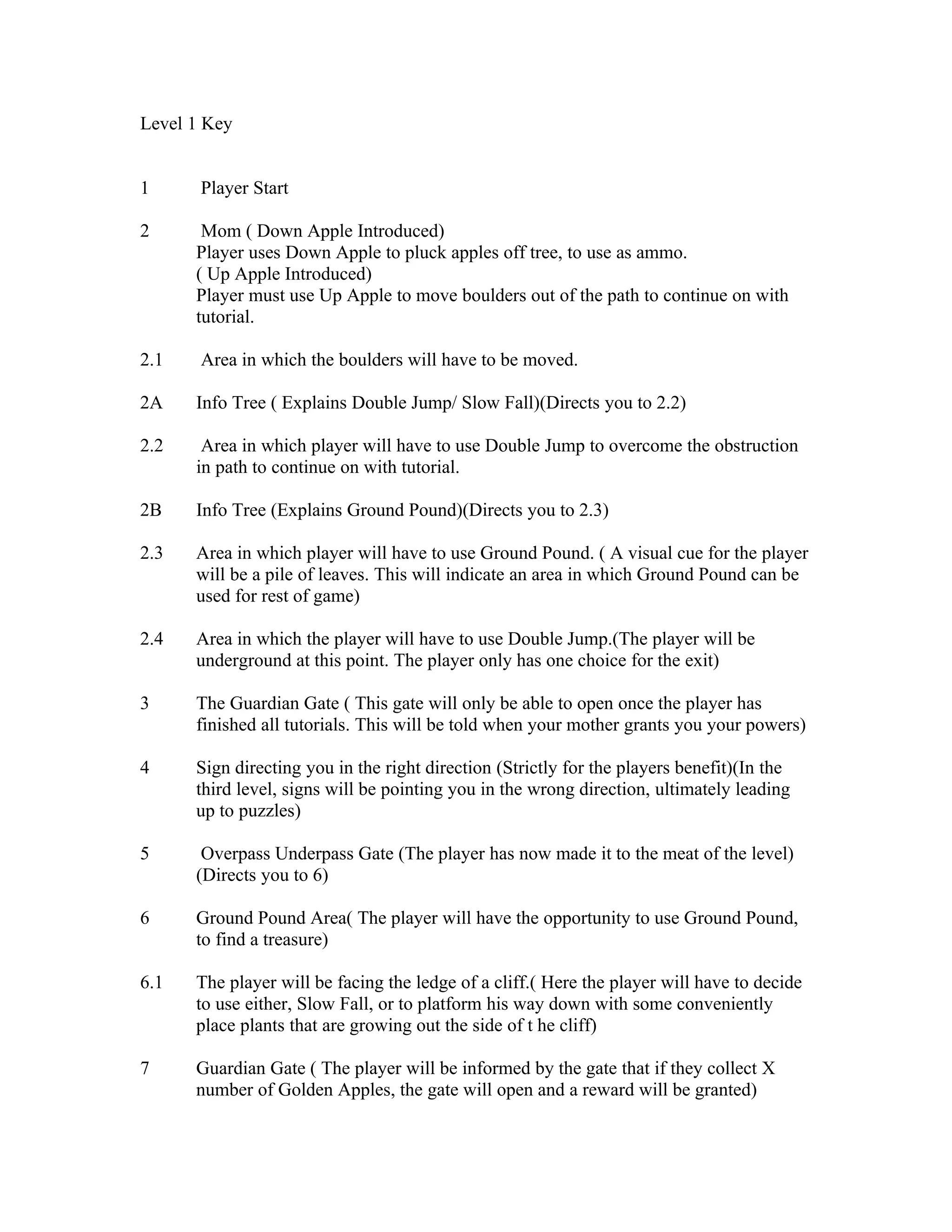 This document outlines a level design for a video game tutorial that teaches players various mechanics through a series of areas. It introduces gameplay elements like using apples to move objects and introduces mechanics like double jumping and ground pounding. It directs players through the level with info trees and signs. Challenges include moving boulders, double jumping over obstacles, ground pounding in leaf piles, and navigating underground. Rewards like golden apples and blueprints can be found. The level ends crossing a bridge between waterfalls with a statue of Isaac Newton.